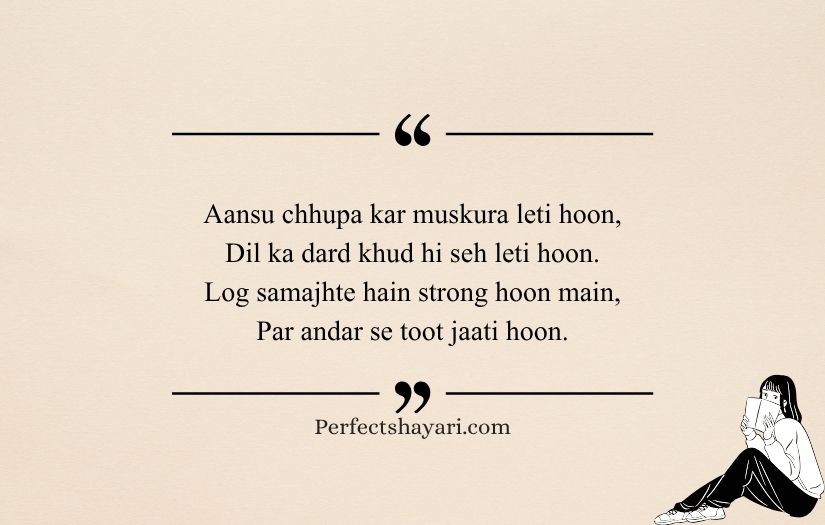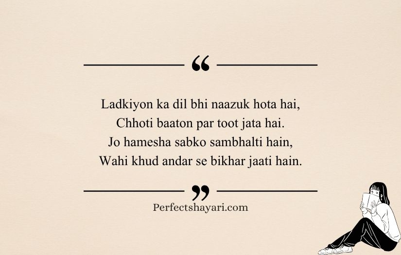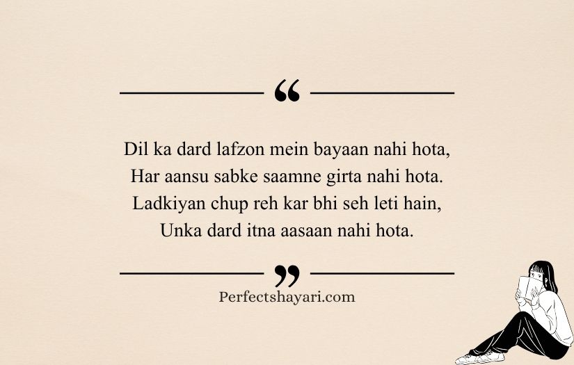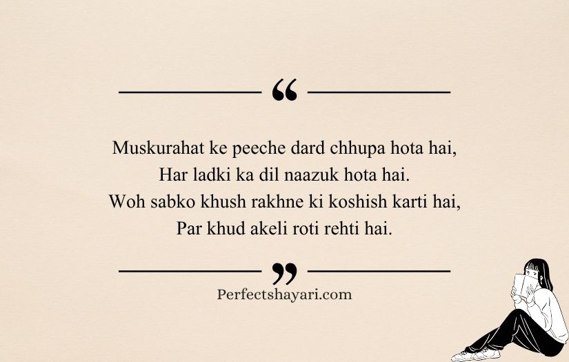 This type of shayari connects strongly with readers because it mirrors real-life experiences and inner feelings. It may describe silent tears, lost relationships, and the pain of being misunderstood. Through simple yet emotional words, sad shayari helps girls express what they often cannot say openly.